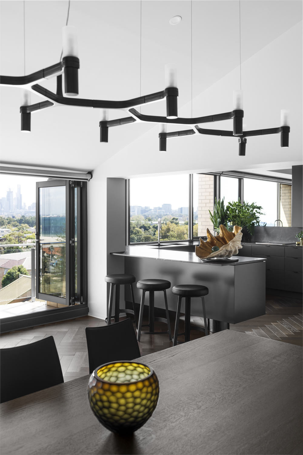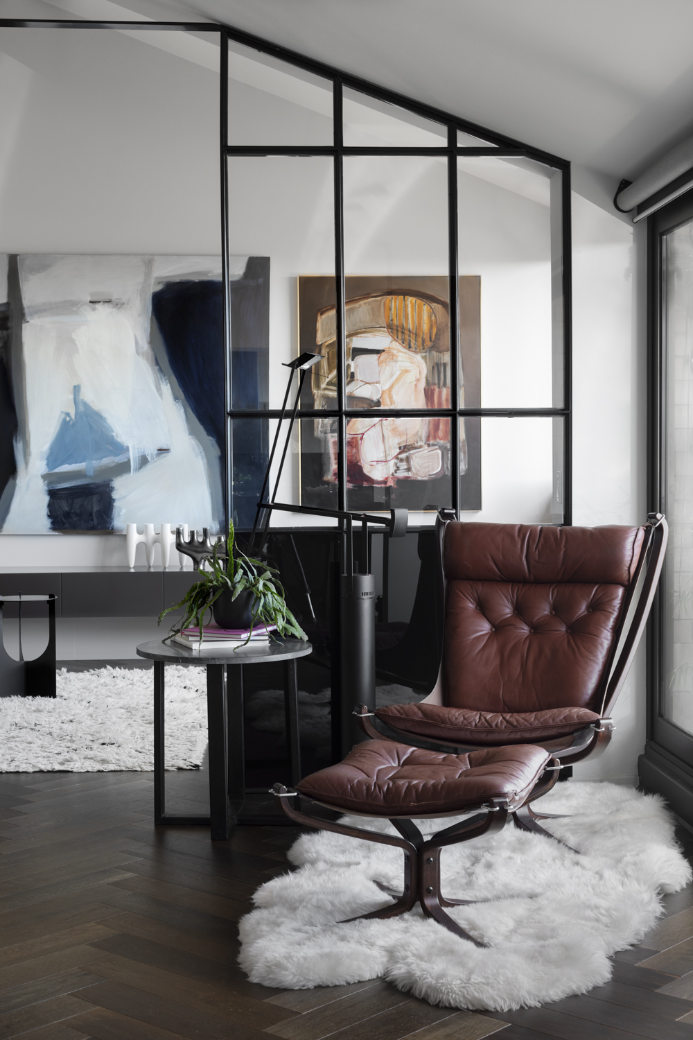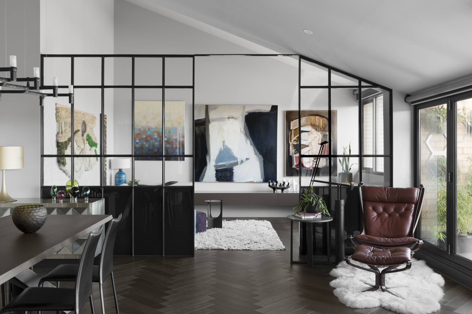 The apartment “suffered” from having a living area that was too large in scale to efficiently arrange various sitting and eating areas, so we installed steel and glass partitions which created a “snug” for a cosier family area and installed a linear desk which sails under the bay-facing windows to create an office area.