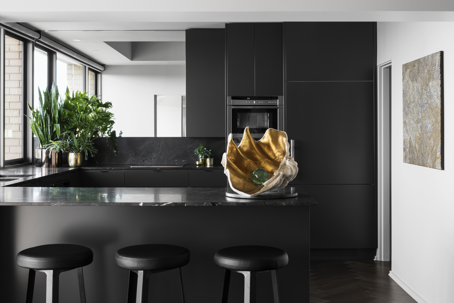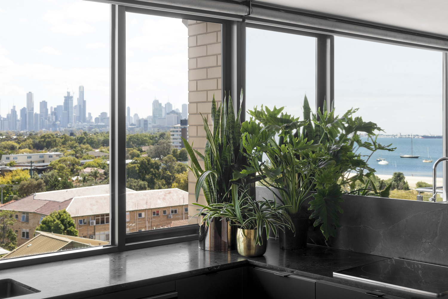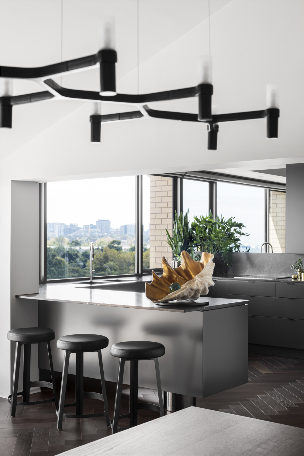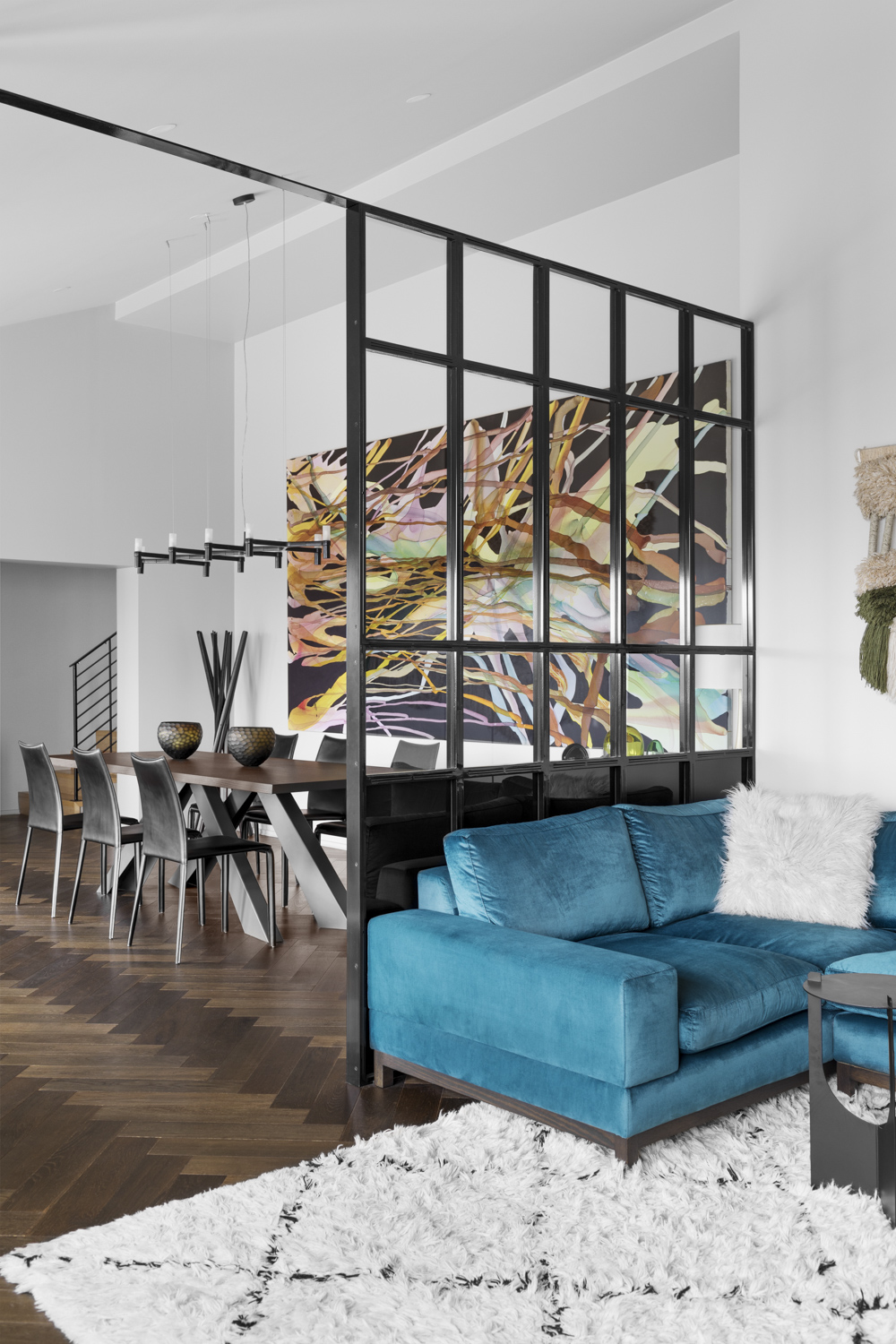 The apartment “suffered” from having a living area that was too large in scale to efficiently arrange various sitting and eating areas, so we installed steel and glass partitions which created a “snug” for a cosier family area and installed a linear desk which sails under the bay-facing windows to create an office area.